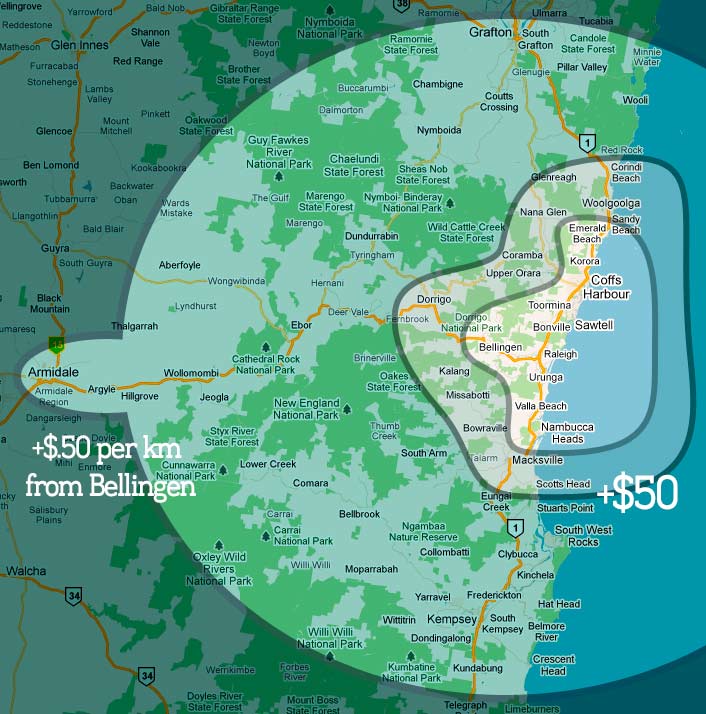 We'll travel from Thora to Emerald Beach to Nambucca Heads for no extra cost.